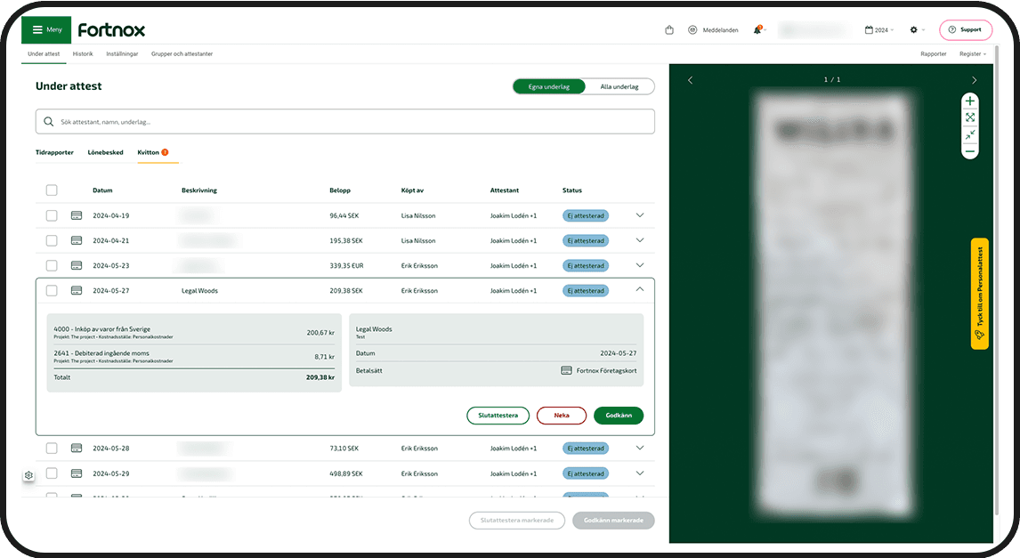 När något finns att attestera får den ansvarige en notis om det, och kan enkelt granska underlaget. Underlag som inte är kompletta eller har några andra fel kan skickas tillbaka till användaren med en kommentar om vad som behöver kompletteras eller varför det nekades. Först när köpen är attesterade skickas de in i bokföringen.