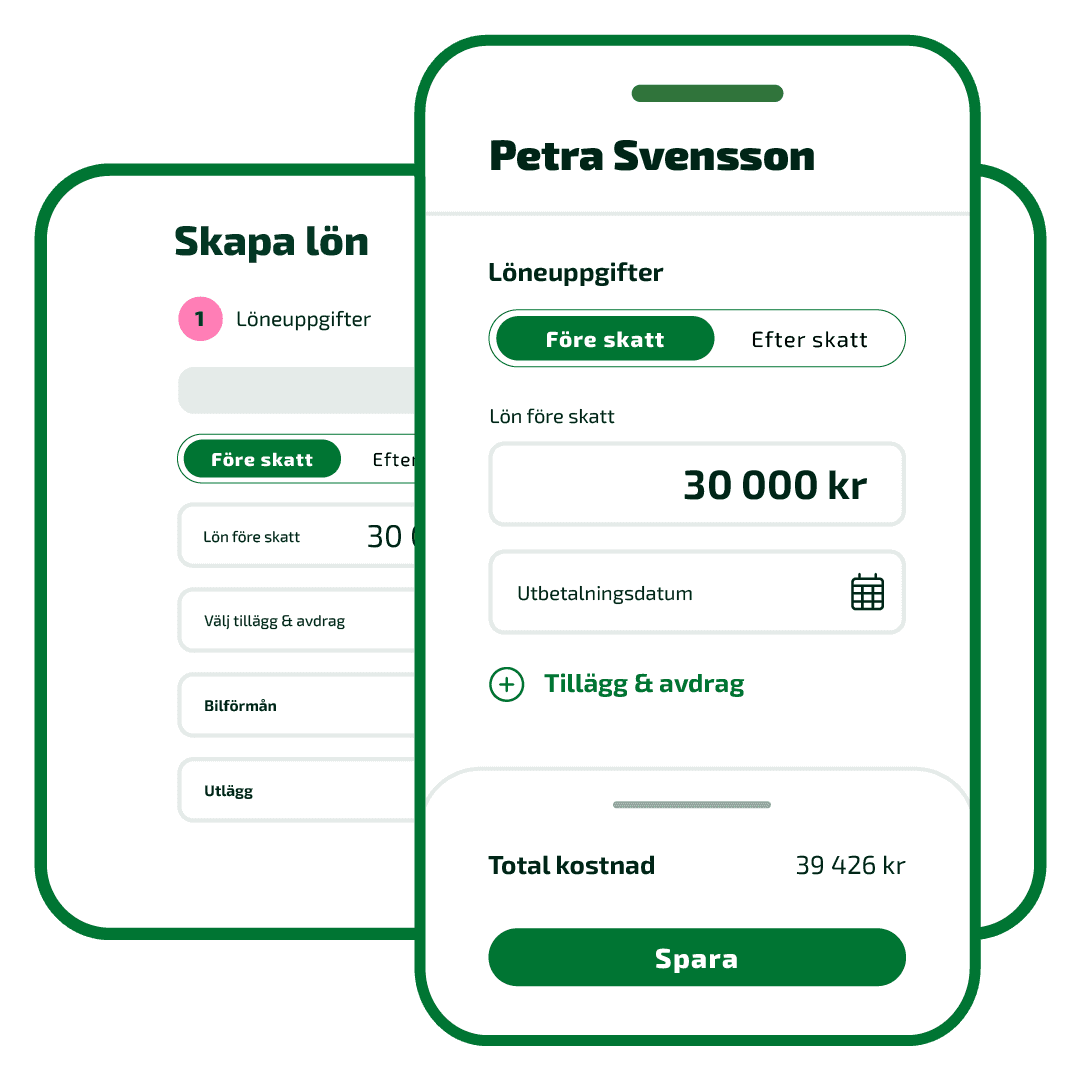 Betala ut lön till dig själv via mobilen eller webben. Ange lönen före eller efter skatt, och när den ska betalas ut.