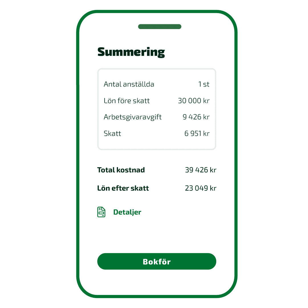 Rätt skatt och arbetsgivaravgift dras automatiskt. Bokför lönen med ett klick – sedan betalar du ut den.