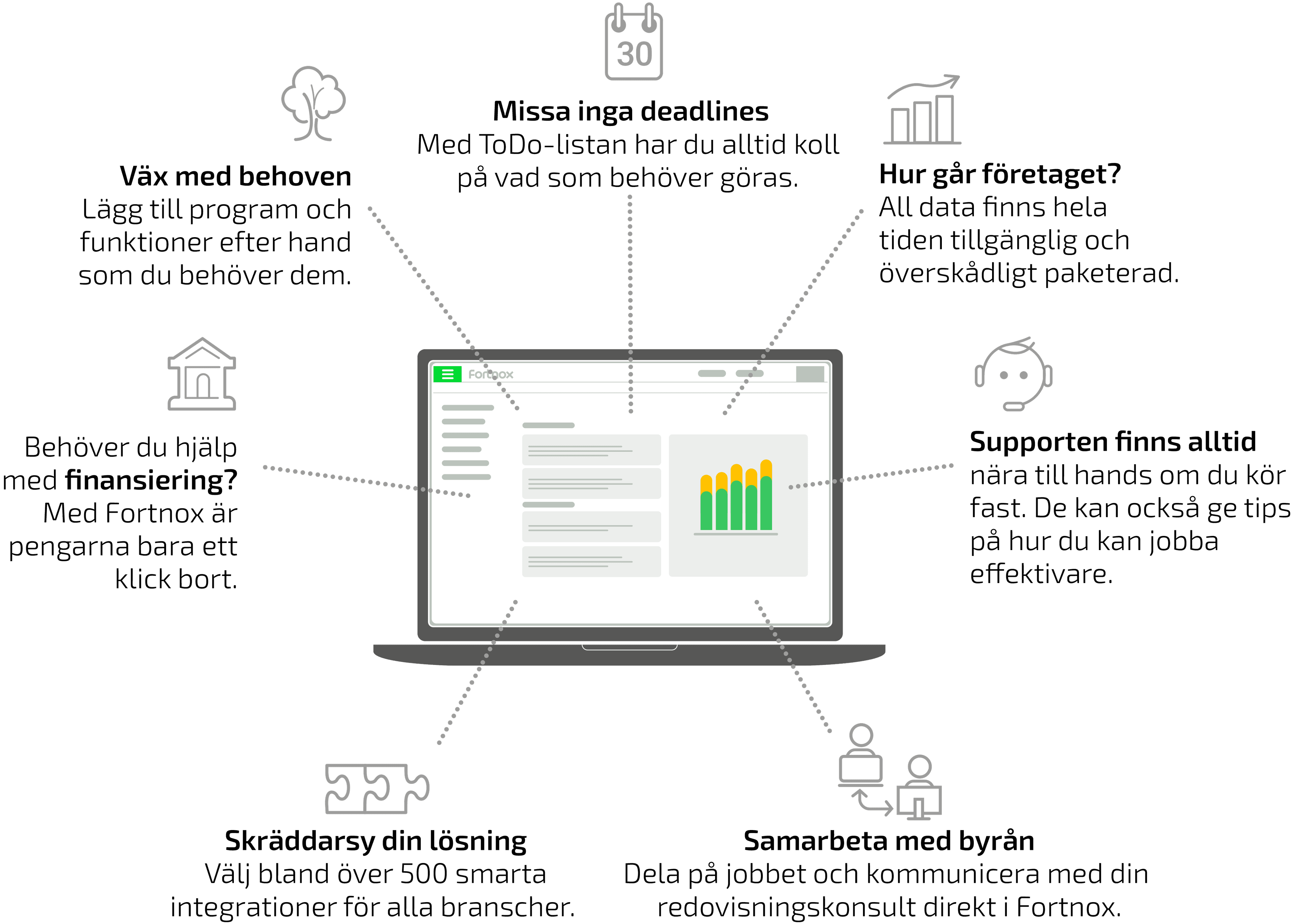 Oavsett om du bara vill bokföra och ta betalt – eller om du vill byta från ett annat stort system – så öppnar Fortnox dörren till ett smartare arbetssätt. Vi knyter helt enkelt ihop alla arbetsflöden och låter smart automatik göra mycket av jobbet. Program och tjänster hänger ihop och bildar ett effektivt maskineri som ger dig större trygghet och bättre kontroll.